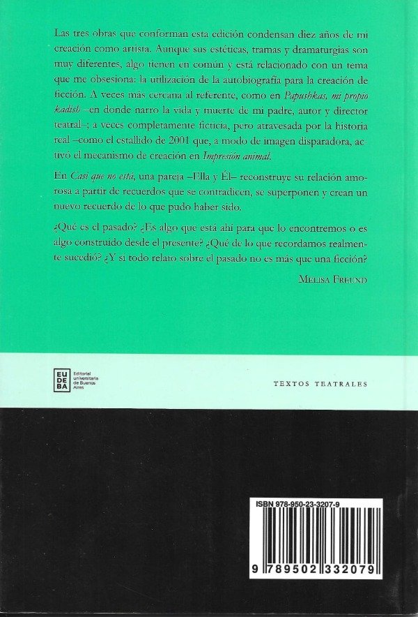 Esta antología reúne tres piezas muy diferentes que, con técnicas originales, cuentan tres historias: la vida de una pareja construida con detalles y fragmentos, instantes casi fotográficos que muestran un doloroso tránsito hacia el final en Casi que no está; escenas de una época que marcó la vida de nuestro país y personajes que atraviesan los vaivenes de una crisis cuyo recuerdo todavía persiste en Impresión animal; y la más personal pero no por eso menos magnética y conmovedora, Mi propio Kadish, en la que Melisa Freund rinde homenaje a su padre, el dramaturgo Juan Freund.