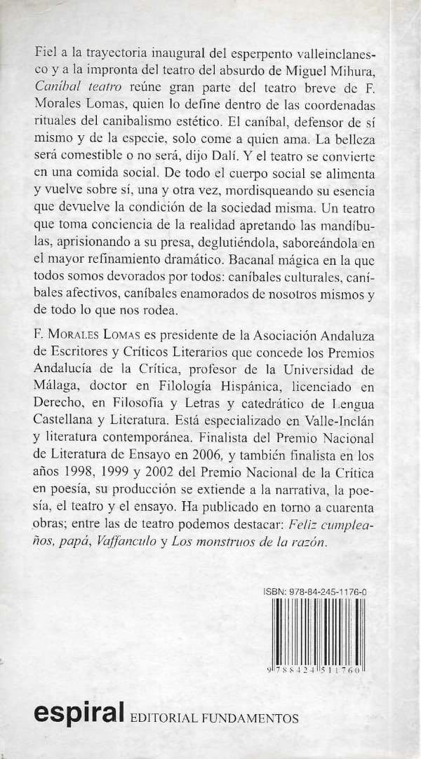 Fiel a la trayectoria inaugural del esperpento valleinclanesco y a la impronta del teatro del absurdo de Miguel Mihura, Caníbal teatro reúne gran parte del teatro breve de F. Morales Lomas, quien lo define dentro de las coordenadas rituales del canibalismo estético. El caníbal, defensor de sí mismo y de la especie, solo come a quien ama. La belleza será comestible o no será, dijo Dalí. Y el teatro se convierte en una comida social. De todo el cuerpo social se alimenta y vuelve sobre sí, una y otra vez, mordisqueando su esencia que devuelve la condición de la sociedad misma. Un teatro que toma conciencia de la realidad apretando las mandíbulas, aprisionando a su presa, deglutiéndola, saboreándola en el mayor refinamiento dramático. Bacanal mágica en la que todos somos devorados por todos: caníbales culturales, caníbales afectivos, caníbales enamorados de nosotros mismos y de todo lo que nos rodea.