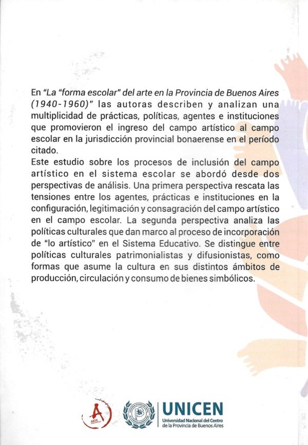 La ‘forma escolar’ del arte. Provincia de Buenos Aires (1940-1960) es producto de las indagaciones y reflexiones sostenidas por las autoras (directora de tesis y tesista, respectivamente) en el marco de la elaboración de la Tesis de Maestría en Educación con mención en Ciencias Sociales, entre los años 1999 y 2002, en la Facultad de Ciencias Humanas de la Universidad Nacional del Centro de la Provincia de Buenos Aires. En este recorrido histórico institucional de las décadas estudiadas las autoras han obtenido algunos hallazgos, pero principalmente múltiples interrogantes que sostienen hasta el presente, en el afán de comprender el lugar de la Educación Artística en el Sistema Educativo.
