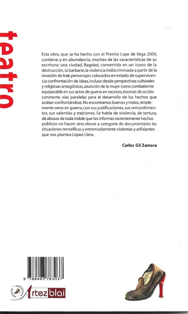 Esta obra, contiene, y en abundancia, muchas de las características de la escritura de César López Llera: una ciudad, Bagdad, convertida en un icono de la destrucción, la barbarie, la violencia indiscriminada a partir de la invasión de Irak; personajes colocados en estado de supervivencia; confrontación de ideas, incluso desde perspectivas culturales y religiosas antagónicas, asunción de la mujer combatiente equiparable en sus actos de guerra en excesos, escenas de acción constante, vías paralelas para el desarrollo de los hechos que acaban confrontándose. No encontramos buenos y malos, simplemente seres en guerra. habla de violencia, de tortura, de abusos de toda índole que los informes hechos públicos no hacen sino elevar a categoría de documentales las situaciones terroríficas y extremadamente violentas que nos plantea López Llera.