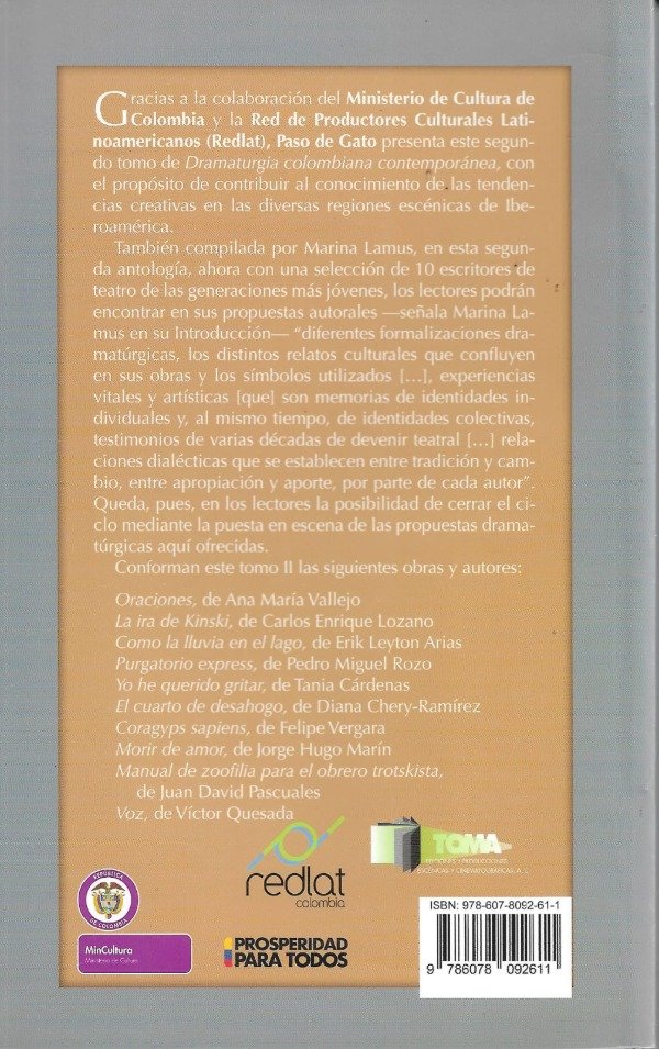 Compilada también por Marina Lamus, esta segunda antología de dramaturgia colombiana reúne a 10 escritores de teatro de generaciones jóvenes. El lector podrá encontrar en sus propuestas autorales, “diferentes formalizaciones dramatúrgicas [y] distintos relatos culturales que confluyen en sus obras”. Conforman este tomo las obras de Ana María Vallejo, Carlos Enrique Lozano, Erik Leyton, Pedro Miguel Rozo, Tania Cárdenas, Diana Chery-Ramírez, Felipe Vergara, Jorge Hugo Marín, Juan David Pascuales y Víctor Quesada.