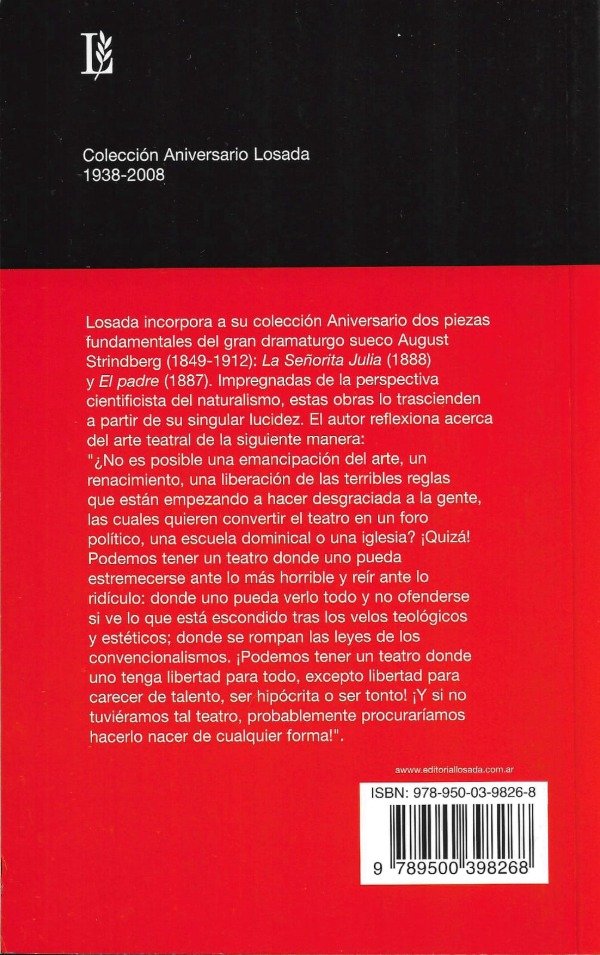 Dos piezas fundamentales del gran dramaturgo sueco August Strindberg (1849-1912): La Señorita Julia (1888) y El padre (1887), impregnadas de la perspectiva cientificista del naturalismo. Estas obras lo trascienden a partir de su singular lucidez.