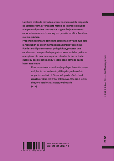 Este libro pretende contribuir al entendimiento de la propuesta de Bertolt Brecht. El verdadero motivo de interés es entusiasmar por un tipo de teatro que nos haga trabajar en nuestro conocimiento sobre el mundo y nos permita incidir sobre él con nuestra práctica. Proponemos pensarlo como una aproximación y una guía para la realización de experimentaciones actorales y escénicas. Puede ser útil para contextos pedagógicos, procesos que conduzcan a un espectáculo, organizaciones sociales, políticas o simplemente para quien quiera entender de qué se trata, cuál es su posible sentido hoy y, sobre todo, cómo se puede hacer este teatro.
